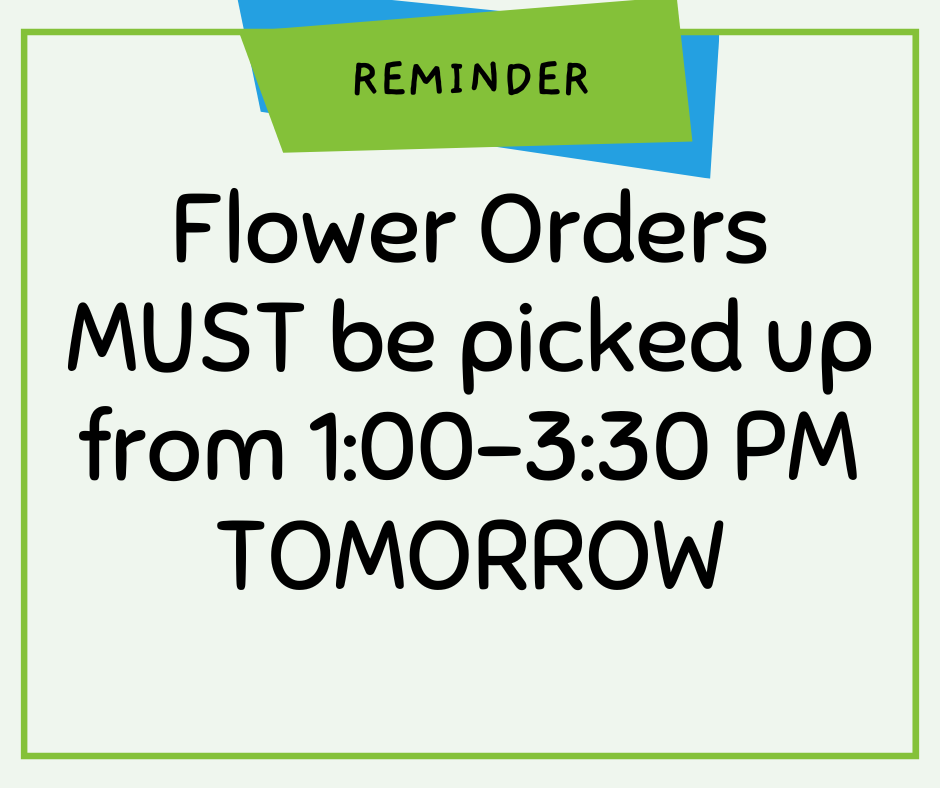 Flower orders must be picked up from 1:00-3:30 pm tomorrow.