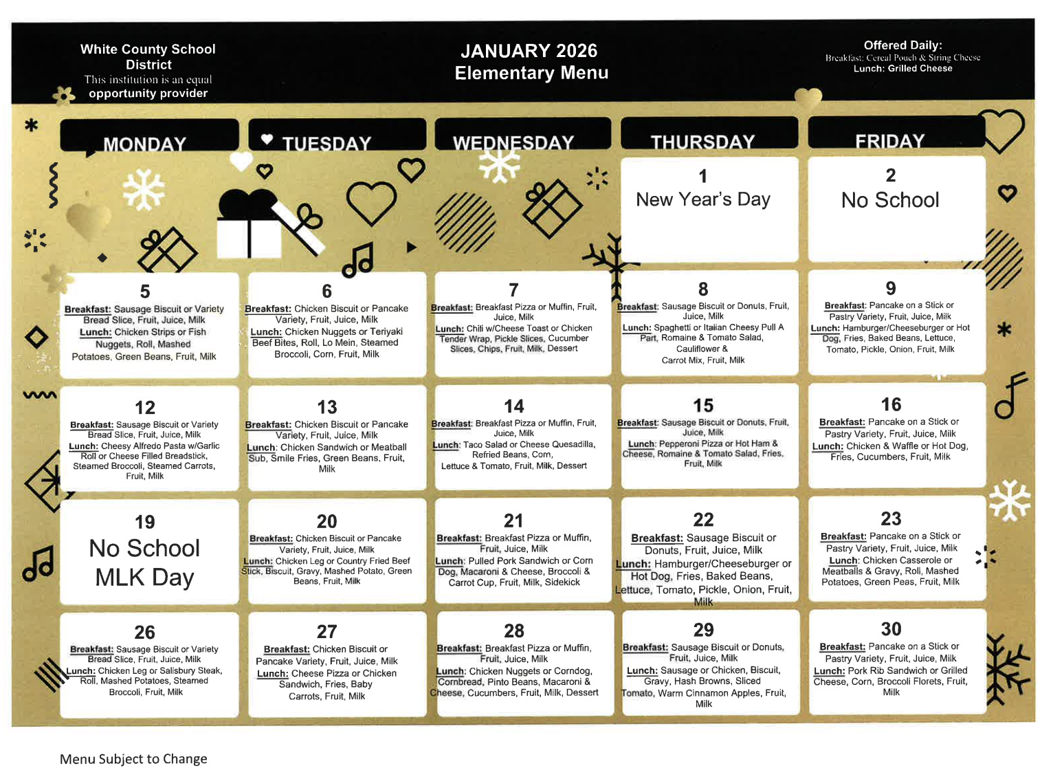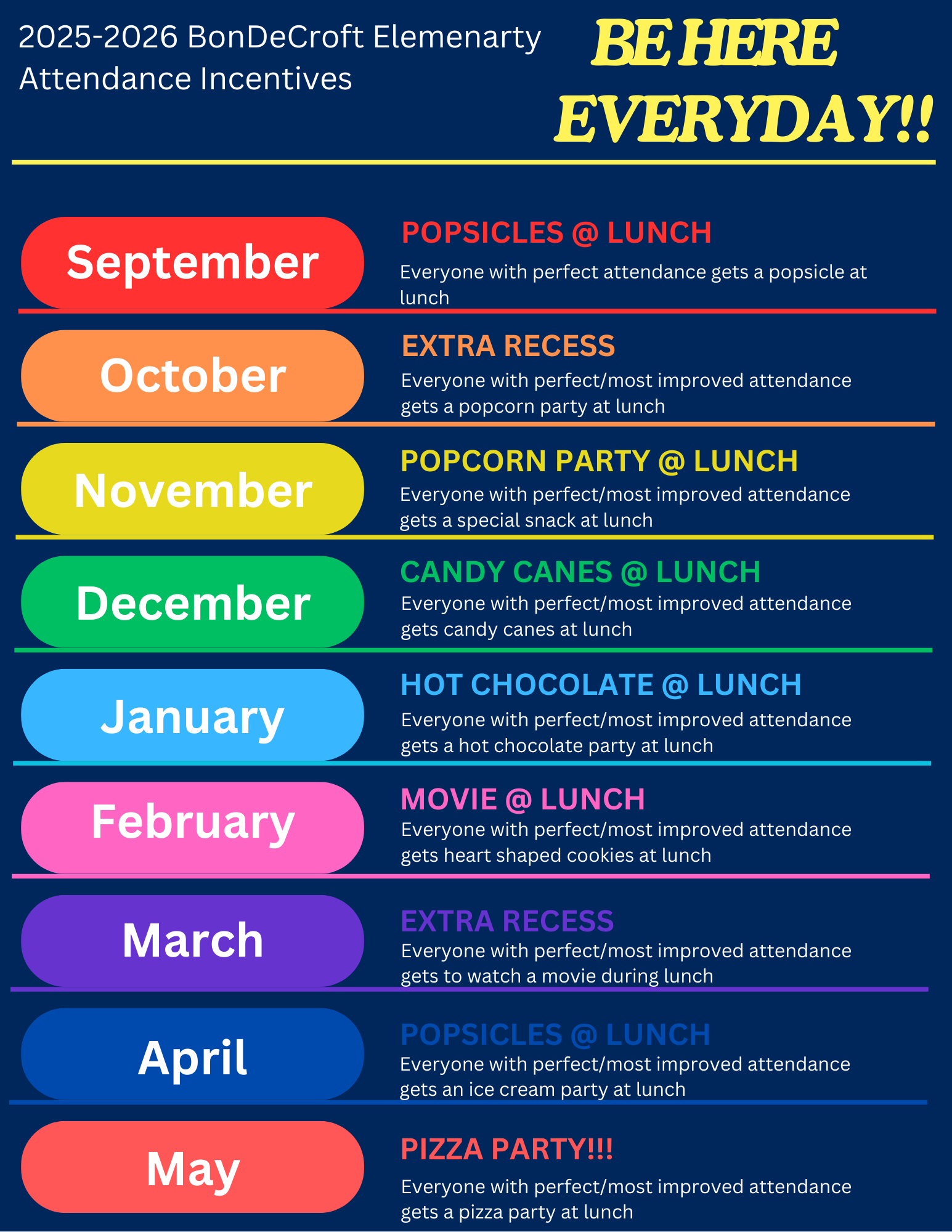January perfect attendance challenge is underway.  Students who do not miss a day in January will receive a special treat at the end of the month.  Encourage and support your child to have perfect attendance this month.  Try to schedule appointments after school or on breaks!